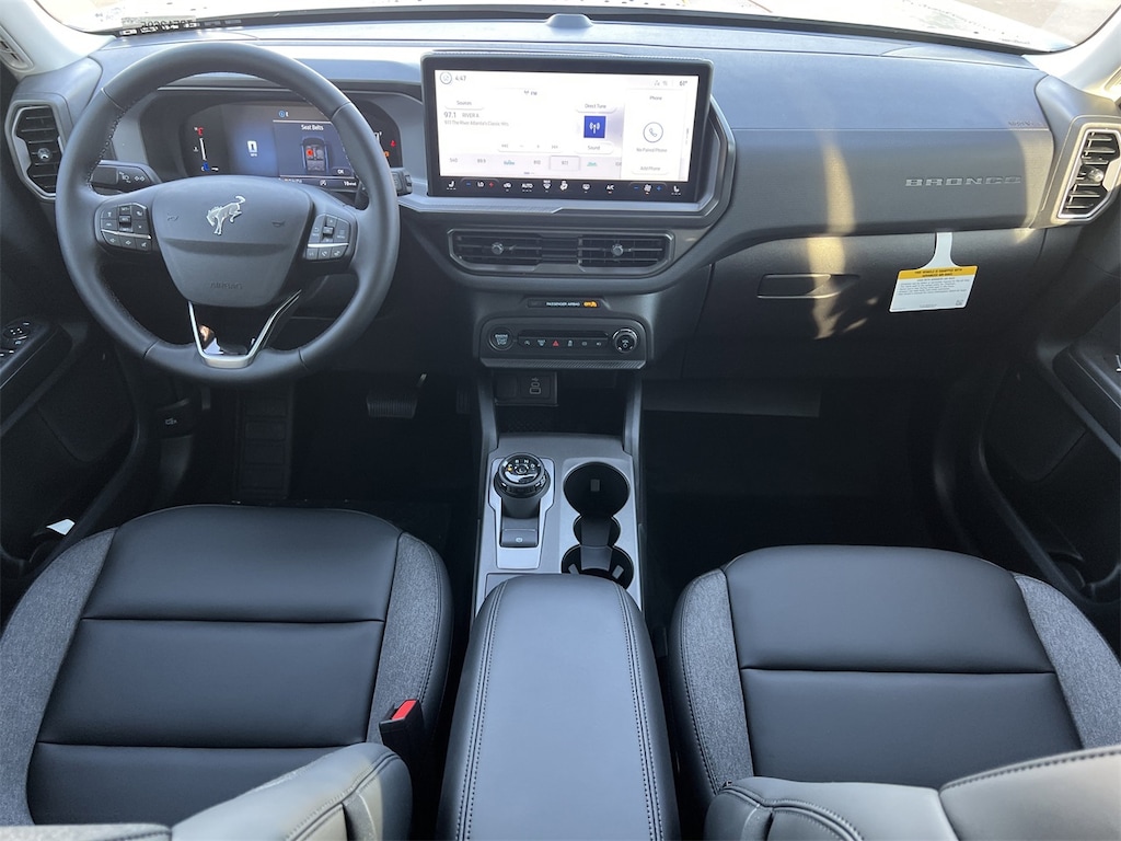 Black Appearance Package (Carbon Black Grille with Black Painted BRONCO Lettering, Cargo Mat, Front and Rear Floor Liners Without Carpet Mats, Front Driver/Passenger Seat Back Map Pockets, Liftgate with Black BRONCO SPORT Lettering, Painted Shadow Black Roof, Premium Trimmed Front Sport Contour Bucket Seats, and Wheels: 17" Matte Black-Painted Aluminum), Convenience Package (Heated 8-Way Power Driver's Seat, LED Fog Lamps, and Premium Wrapped Steering Wheel), Equipment Group 200A Standard Package (AM/FM Stereo, Cloth with Easy-to-Clean Front Bucket Seats, SiriusXM with 360L, SYNC 4 with Enhanced Voice Recognition, and Wheels: 17" Carbonized Gray Painted Aluminum), Ford Connectivity Package (1-Year Included), Internet access capable: 5G Modem - Ford Connectivity Package, 2nd Row Carpeted Seatback, 4-Wheel Disc Brakes, 6 Speakers, ABS brakes, Air Conditioning, Alloy wheels, AM/FM radio: SiriusXM with 360L, Apple CarPlay/Android Auto, Auto High-beam Headlights, Automatic temperature control, Brake assist, Compass, Delay-off headlights, Driver door bin, Driver vanity mirror, Dual front impact airbags, Dual front side impact airbags, Electronic Stability Control, Emergency communication system: SYNC 4 911 Assist, Exterior Parking Camera Rear, Four wheel independent suspension, Front anti-roll bar, Front Bucket Seats, Front Center Armrest, Front reading lights, Fully automatic headlights, Heated door mirrors, Illuminated entry, Knee airbag, Low tire pressure warning, Occupant sensing airbag, Outside temperature display, Overhead airbag, Overhead console, Panic alarm, Passenger door bin, Passenger vanity mirror, Power door mirrors, Power Moonroof, Power steering, Power windows, Radio data system, Rear anti-roll bar, Rear Parking Sensors, Rear reading lights, Rear seat center armrest, Rear window defroster, Rear window wiper, Remote keyless entry, Security system, Speed control, Speed-sensing steering, Speed-Sensitive Wipers, Split folding rear seat, Steering wheel mounted audio controls, Tachometer, Telescoping steering wheel, Tilt steering wheel, Traction control, Trip computer, and Variably intermittent wipers.