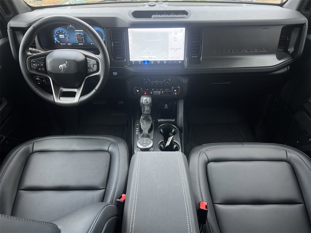 Black Diamond Package (Auxiliary Switches, LED Fog Lamps, Powder Coated Steel Front & Rear Bumpers, Rock Rails, Washout Capable Rubberized Flooring, and Wheels: 17" Black High Gloss Painted Aluminum), Equipment Group 222A Mid Package (2-Door Intelligent Access w/Lock/Unlock, Ambient Footwell Lighting, Connected Navigation, Dr & Pass Illuminated Sliding Visor Vanity Mirrors, Dual Smart Charging USB Ports, Dual-Zone Electronic Automatic Temperature Control, Front Row Heated Seats, Power Outlet - Back Side of Center Floor Console, and Rear Parking Sensors), 4-Wheel Disc Brakes, 7 Speakers, ABS brakes, Air Conditioning, Alloy wheels, AM/FM radio: SiriusXM with 360L, AM/FM Stereo, Auto High-Beam Headlamps, Auto High-beam Headlights, BLIS Blind Spot Information System, Brake assist, Cloth Bucket Seats, Compass, Delay-off headlights, Driver door bin, Driver vanity mirror, Dual front impact airbags, Dual front side impact airbags, Electronic Stability Control, Emergency communication system: 911 Assist, Exterior Parking Camera Rear, Front & Rear Floor Liners w/o Carpet Floor Mats, Front anti-roll bar, Front Bucket Seats, Front Center Armrest, Front reading lights, Front wheel independent suspension, Fully automatic headlights, Heated door mirrors, Illuminated entry, Integrated roll-over protection, Internet access capable: FordPass Connect, Lane-Keeping System, Leather Shift Knob, Low tire pressure warning, Occupant sensing airbag, Outside temperature display, Overhead airbag, Overhead console, Panic alarm, Passenger door bin, Passenger vanity mirror, Power door mirrors, Power steering, Power windows, Pre-Collision Assist w/Automatic Emergency Braking, Radio data system, Rear-View Camera, Remote keyless entry, Security system, SiriusXM w/360L, Speed control, Split folding rear seat, Steering wheel mounted audio controls, SYNC 4, Tachometer, Telescoping steering wheel, Tilt steering wheel, Traction control, Trip computer, Variably intermittent wipers, and Wheels: 17" Carbonized Gray-Painted Aluminum.